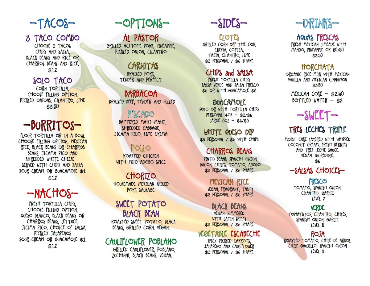 Your choice of 4 oz personal or 12 oz shareable size. Fresco (mild)verde (medium)roja (hot).
